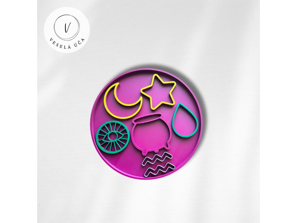 Barevný kulatý tác se sadou originálních vykrajovátek ve tvaru hvězdy, měsíce, kapky, kotlík, vlnky a sluníčka. Ideální pro smyslové hry, tvoření z modelíny, kinetického písku nebo těsta. Podporuje jemnou motoriku, kreativitu i učení tvarů.