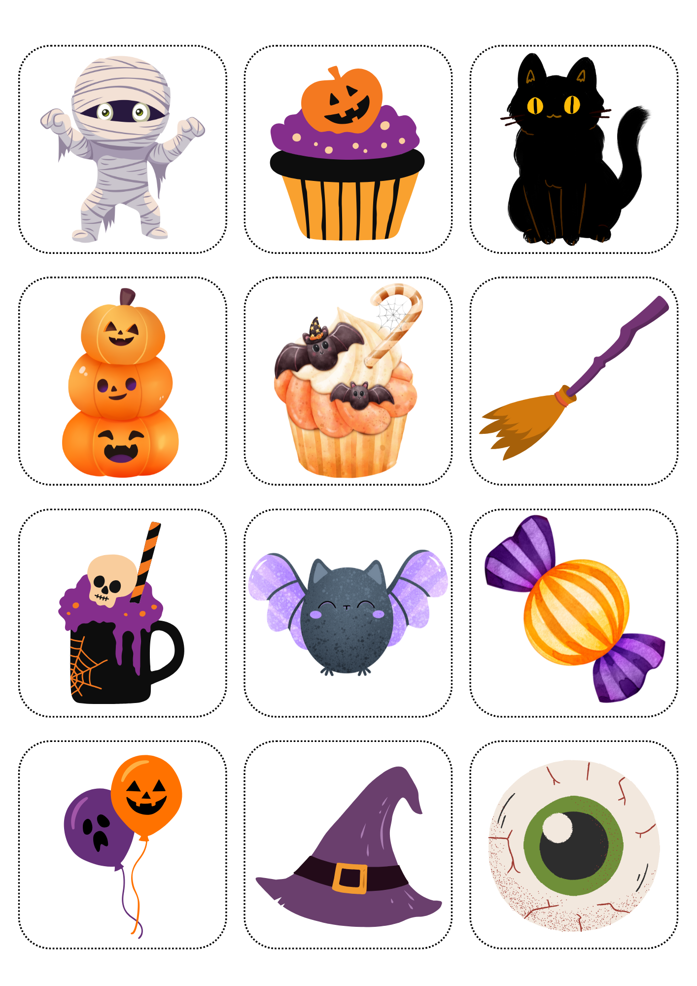 - Herní desky (25) s různými halloweenskými motivy: dýně, netopýři, čarodějnice, duchové, pavouci, černé kočky a další strašidelné symboly.