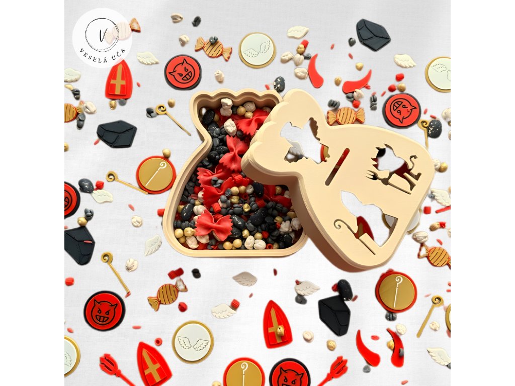 Mikulášské žetony z PLA jsou krásnou pomůckou pro smyslové hraní i předvánoční tvoření. Děti mohou žetony třídit podle symbolu – čert, anděl, Mikuláš, počítat je nebo hledat v sypkém materiálu. Hravé tvary podporují jemnou motoriku, zrakové vnímání i poznávání tradičních postav.