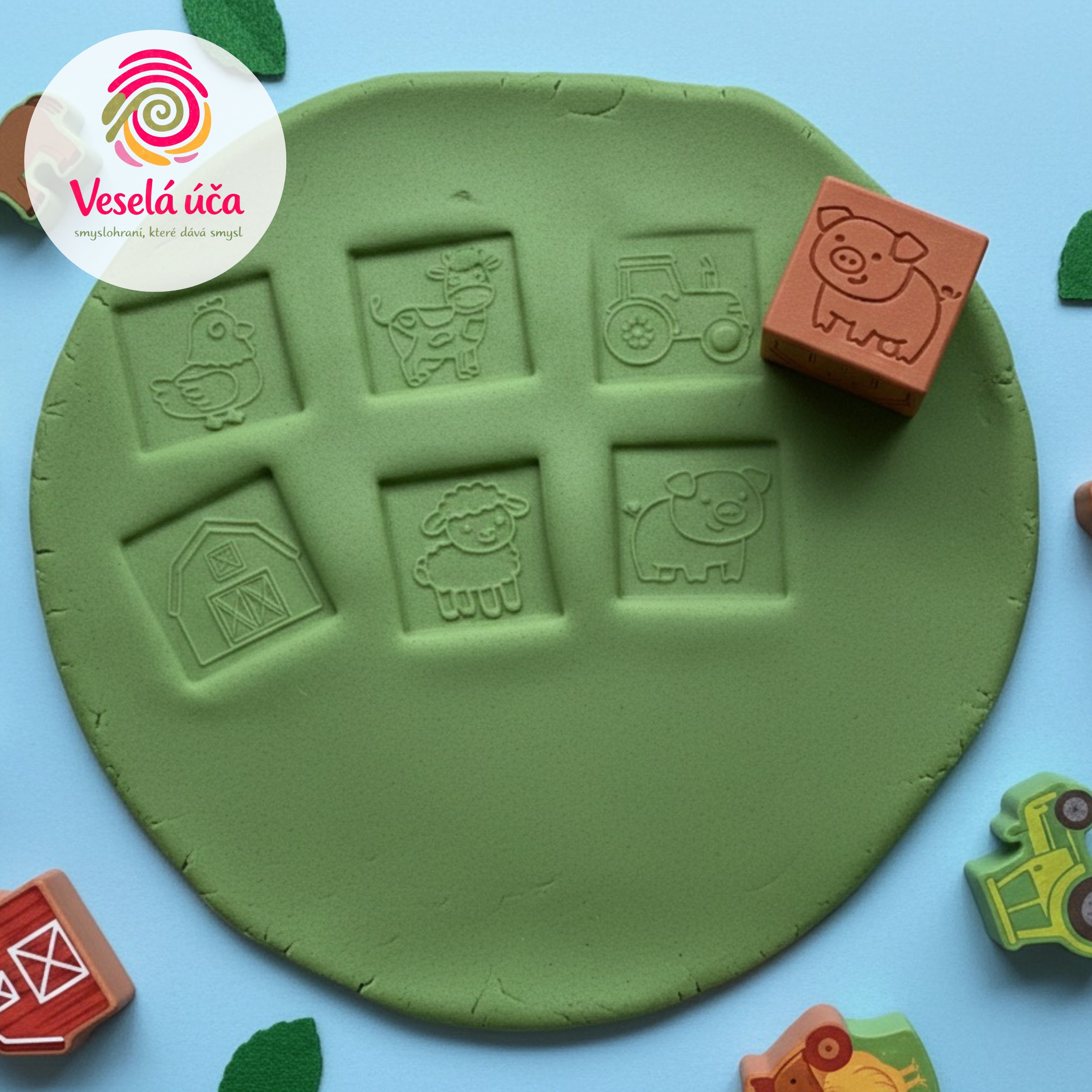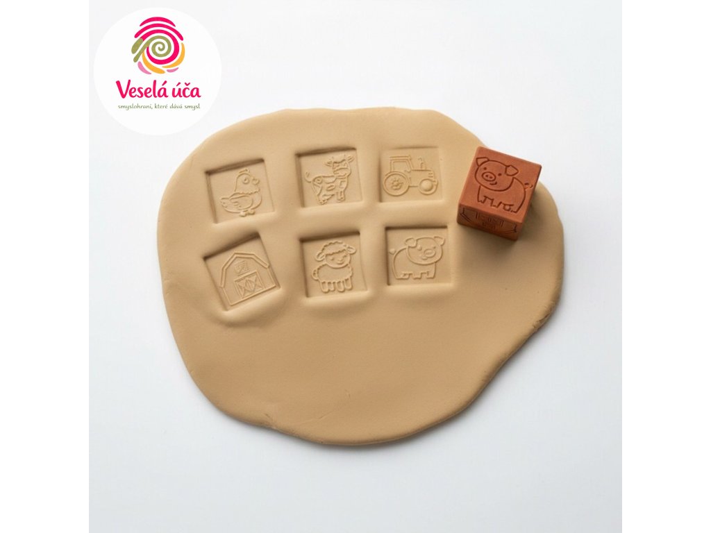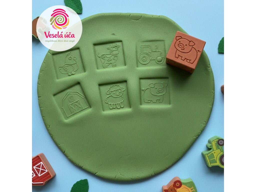 Děti si při obtiskávání vytvářejí vlastní venkovský svět, kde se starají o zvířátka, sklízí na poli a jezdí traktorem. Kostka podporuje fantazii, vyprávění příběhů i jemnou motoriku a skvěle se hodí ke smyslové hře s modelínou nebo kinetickým pískem.