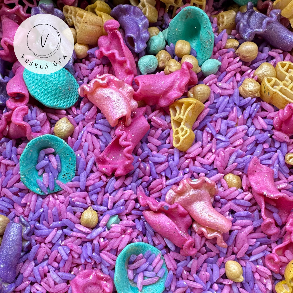 Naše pohádková směs kombinuje různé textury (cizrnu, těstoviny a rýži), které děti motivují k vyprávění příběhů a hledání skrytých pokladů. Je to ideální parťák pro rozvoj řeči, jemné motoriky a nekonečné dětské fantazie.