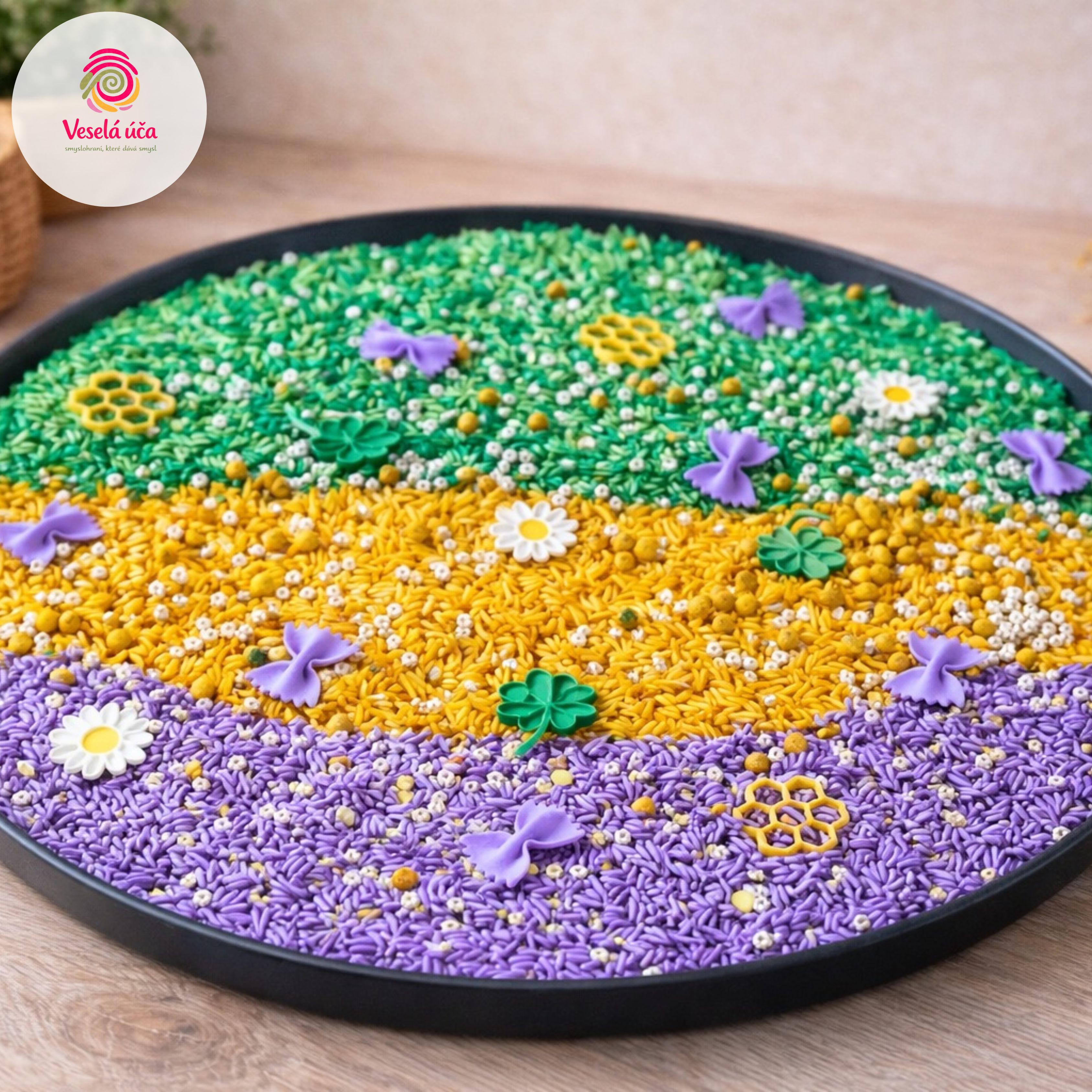 Jarní zahrádka kombinuje svěžest zelené trávy, hřejivost slunce a něžnost fialových květů. Mezi zrnky jsou ukryty hravé detaily jako bílá kvítka, lila motýlci a zelené čtyřlístky, které čekají na své objevitele.