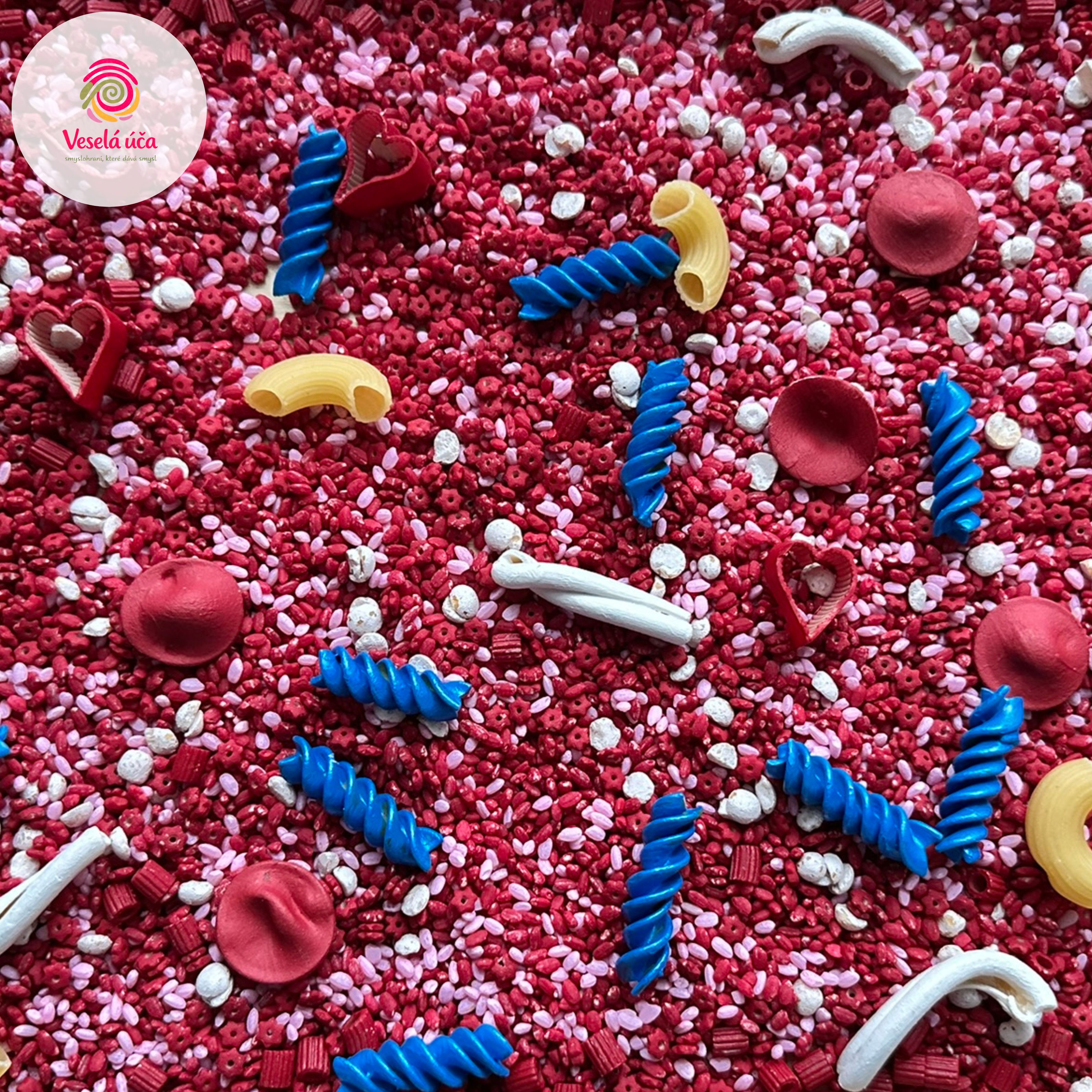 Barevná kombinace rýže a těstovin symbolizuje různé části těla a procesy v něm – od krevního oběhu po orgány a struktury, které děti mohou „objevovat“ v senzorickém světě.