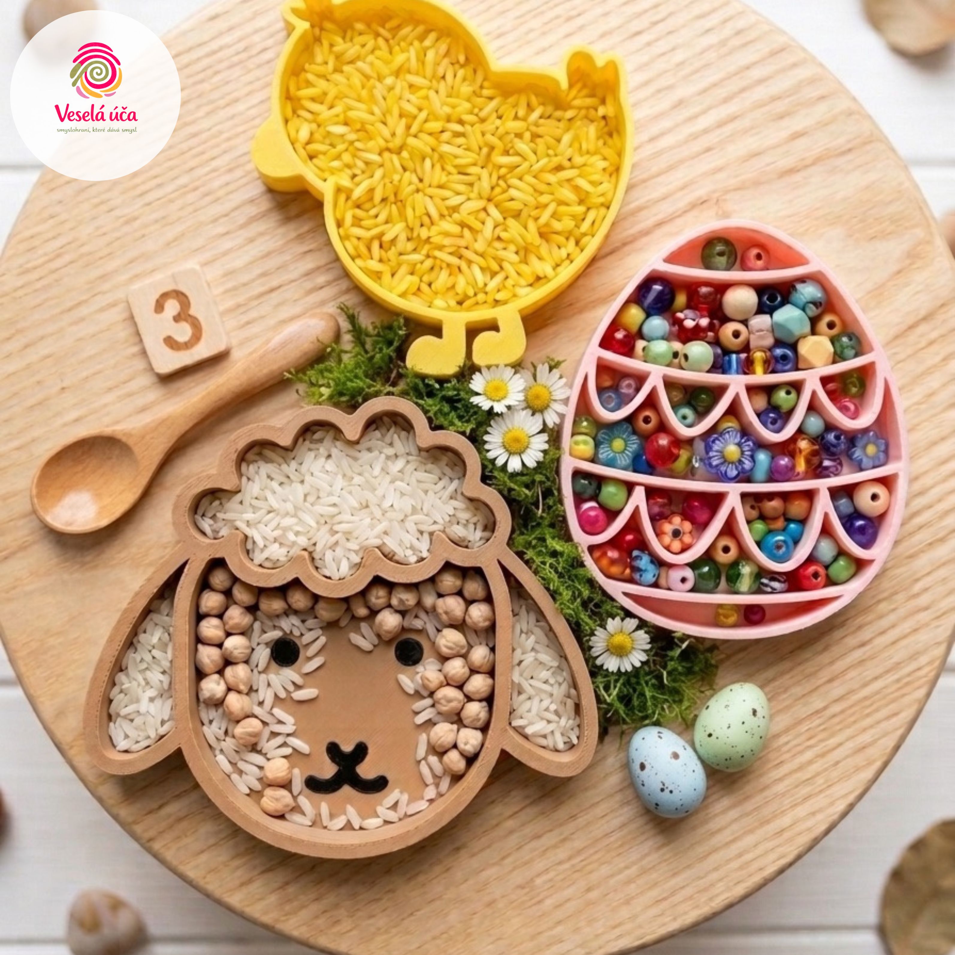 Roztomilé trio – kuřátko, ovečka a vajíčko – navržené pro malé dětské dlaně. Ideální pro první smyslové objevování, třídění rýže a hledání jarních pokladů.