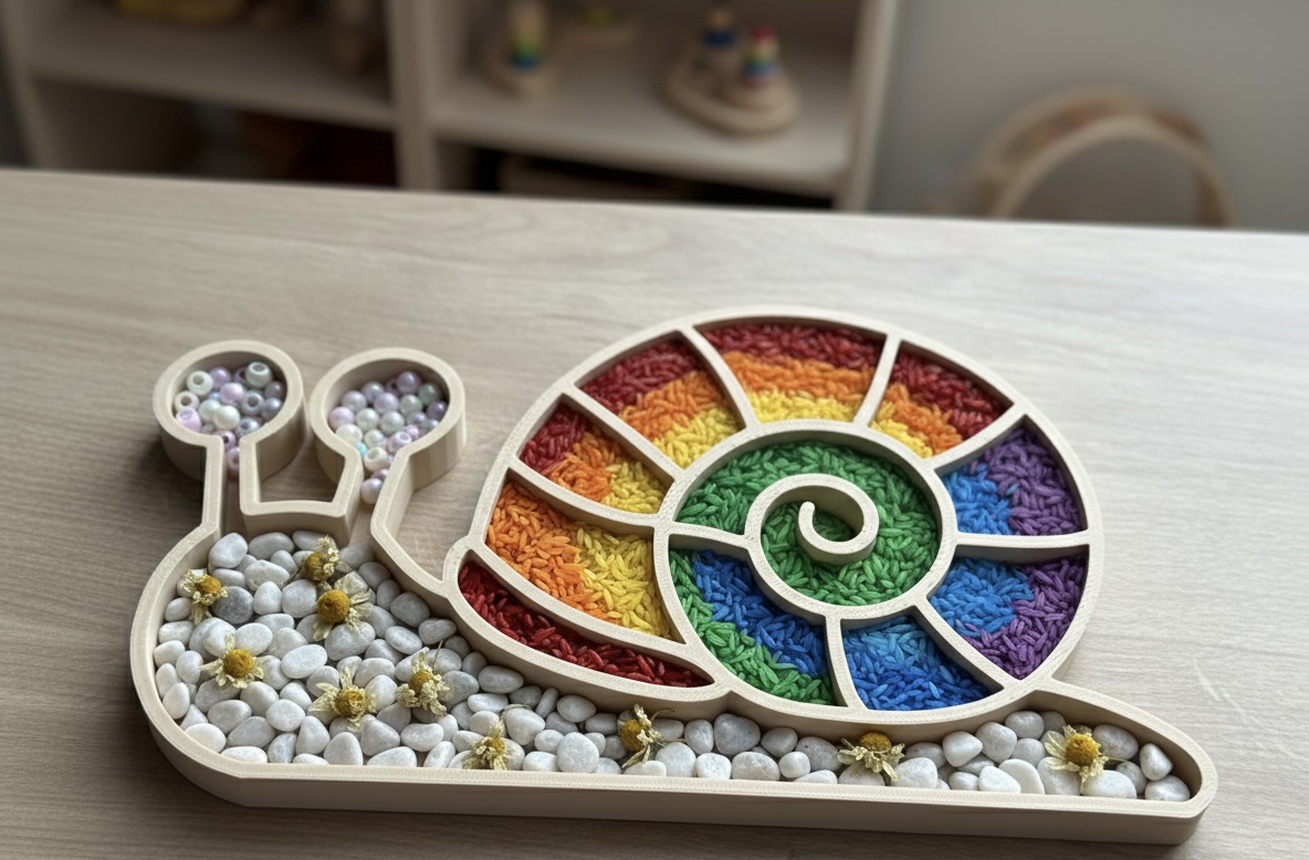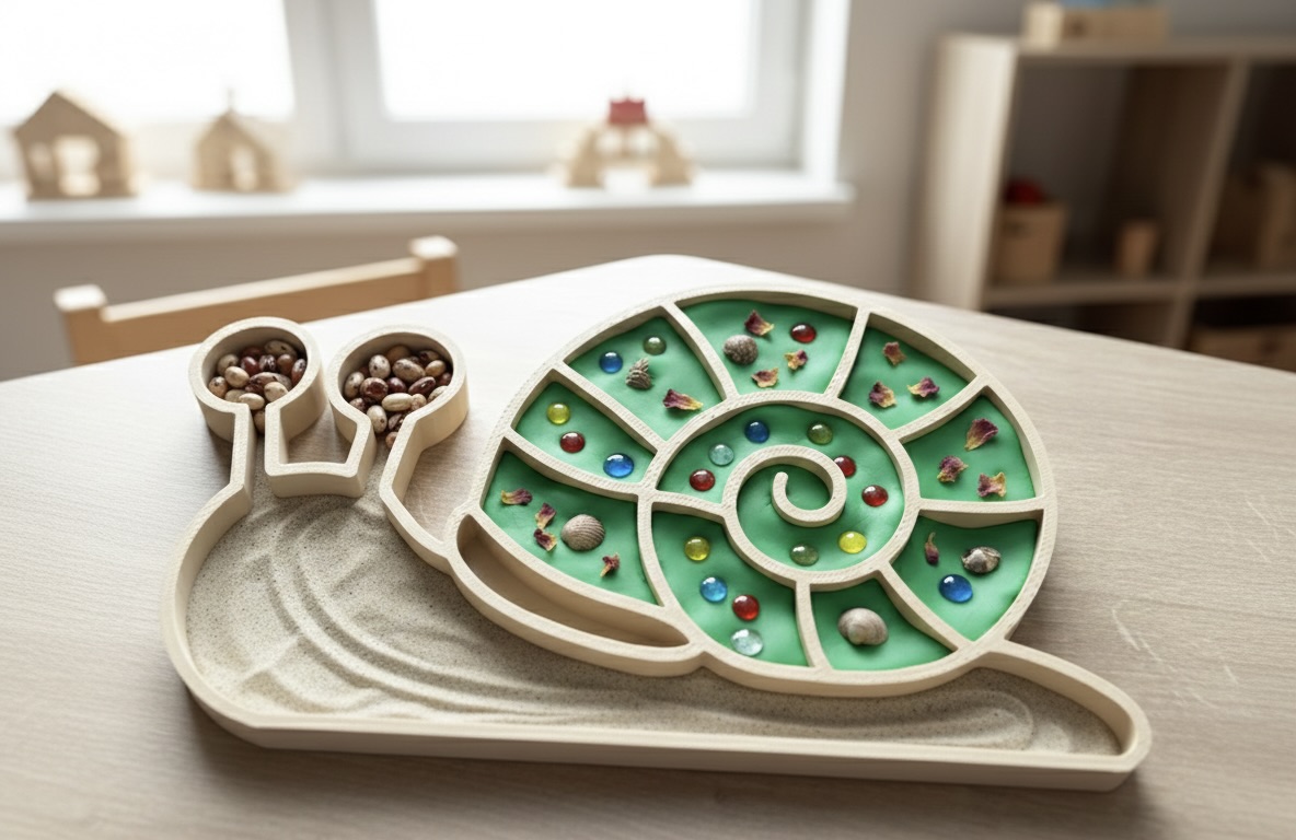 Hledáte způsob, jak hravě procvičit jemnou motoriku? Hmatový vysypávací tác ve tvaru šneka je ideální volbou pro domácí smyslohraní i výuku v mateřských školách. Díky spirálovité ulitě slouží jako přirozený trenažér pro plynulý tah ruky, který je klíčový pro budoucí psaní a kreslení.