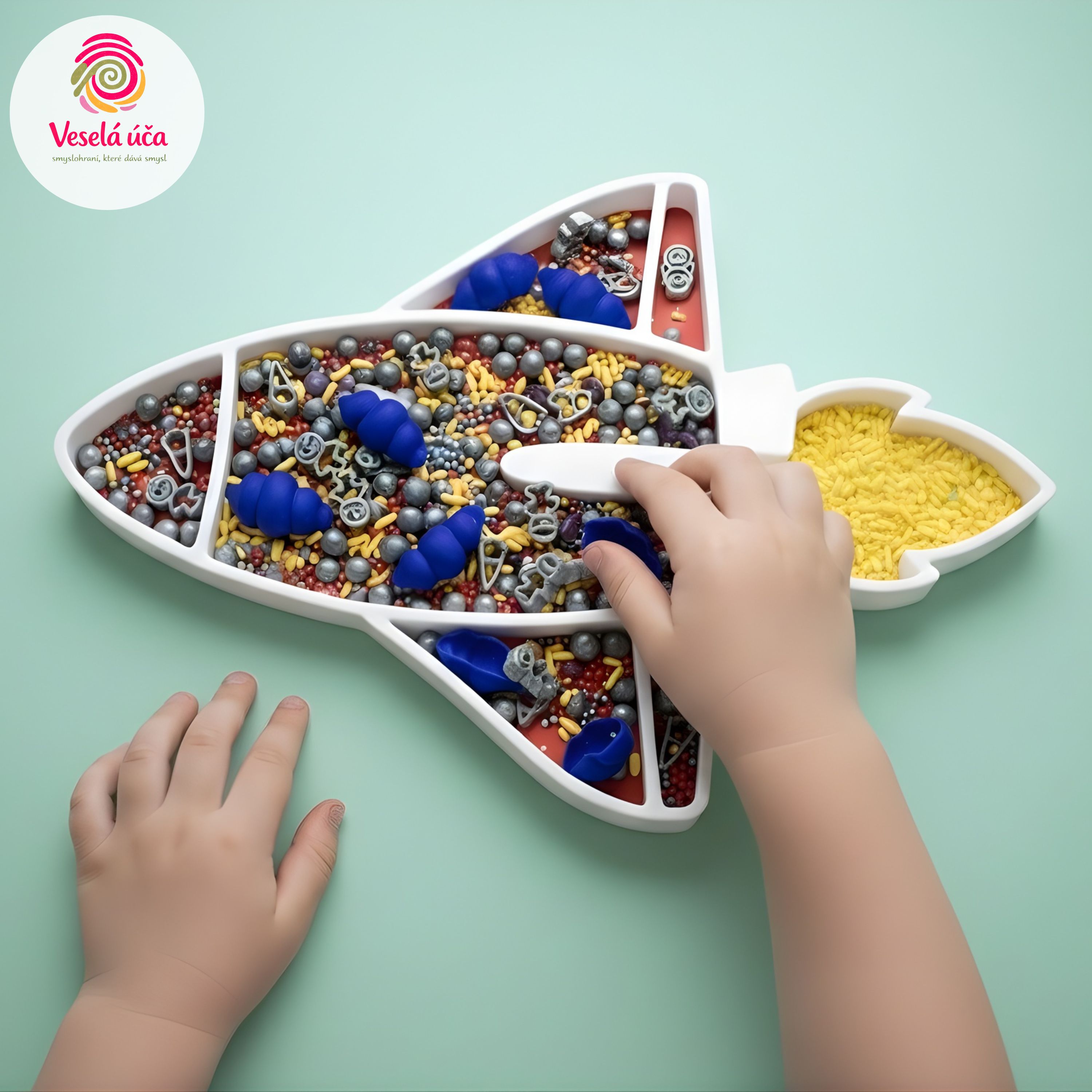 Vysypávací tácek ve tvaru rakety pro smyslové hraní dětí. Podporuje jemnou motoriku, soustředění a fantazii při klidové i tematické hře