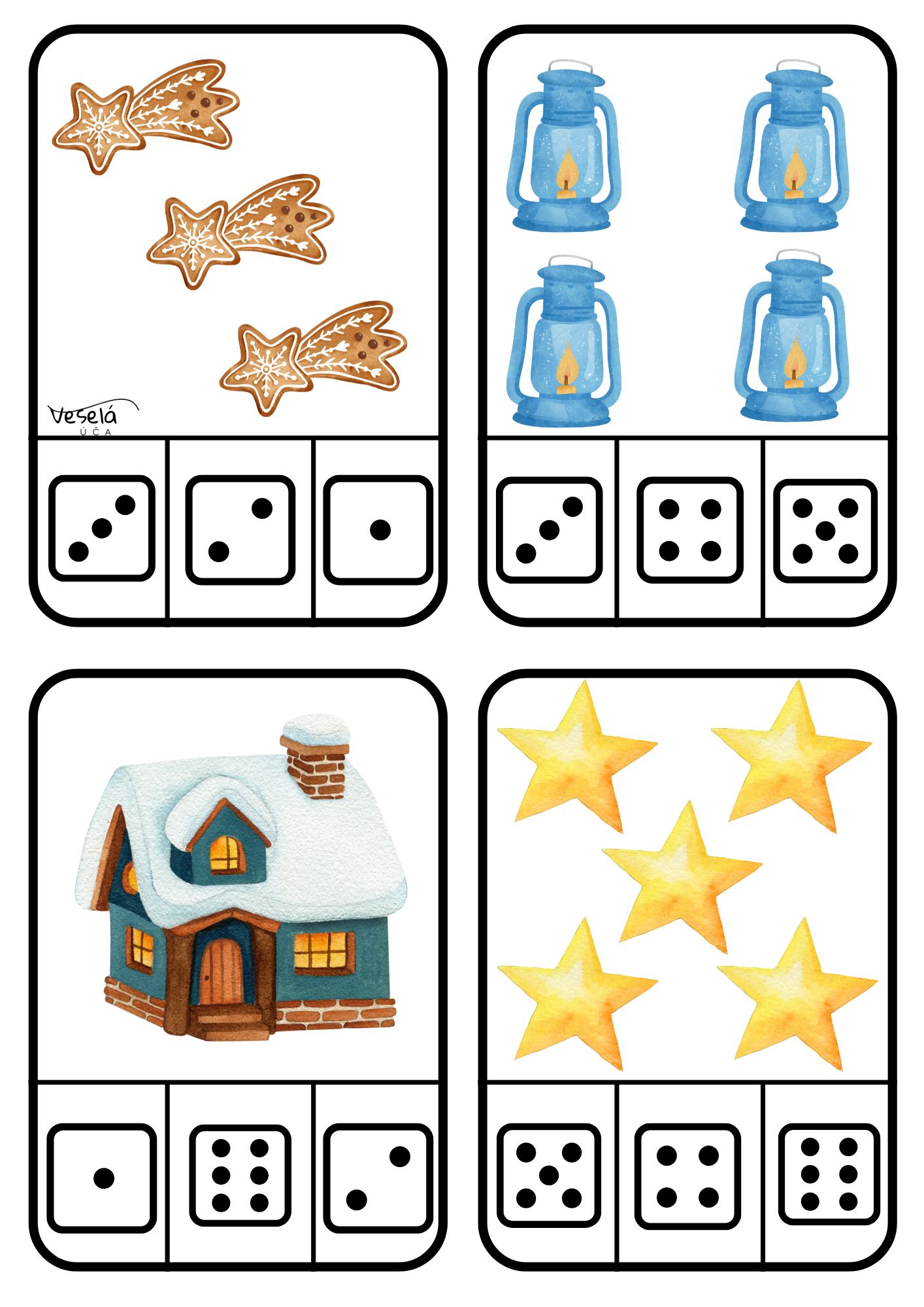 PDF sada kolíčkovacích aktivit ZIMA (88 kartiček) rozvíjí jemnou motoriku, logické myšlení a zrakové vnímání hravou formou. Děti označují správné odpovědi kolíčky, počítají, třídí a porovnávají – vše v krásném zimním designu.