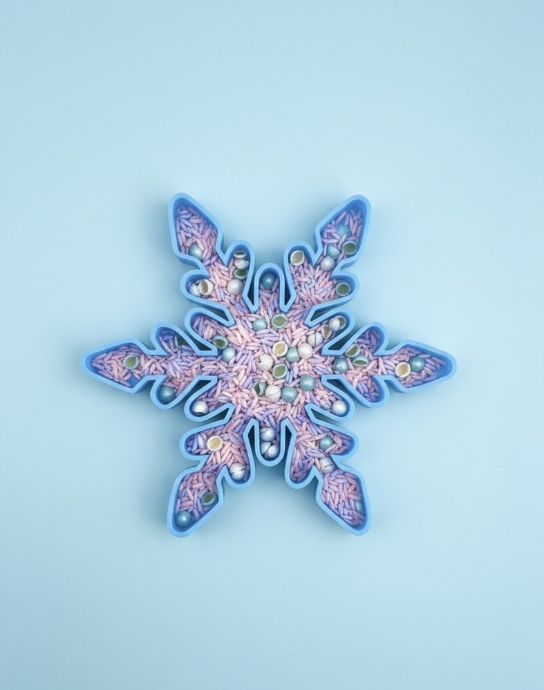 Dvojice originálních zimních táců ve tvaru sněhové vločky, které dodají každému smyslohraní kouzelnou atmosféru zimy. Každý tác má jiný reliéf, takže děti mohou porovnávat tvary, zkoumat linie vloček a tvořit vlastní zimní svět. Ideální pro modelínu, kinetický písek, sypké směsi, umělý sníh i senzorické hmoty.